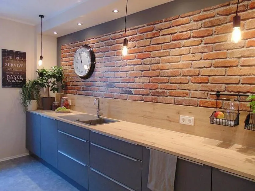 Зачастую кирпичный дизайн практикуют для оформления зоны фартука в кухонном помещении, либо в свободной зоне между раковиной и верхними полками для хранения. Не стоит забывать о том, что материал нуждается в уходе, состоящем в защите и пропитке.