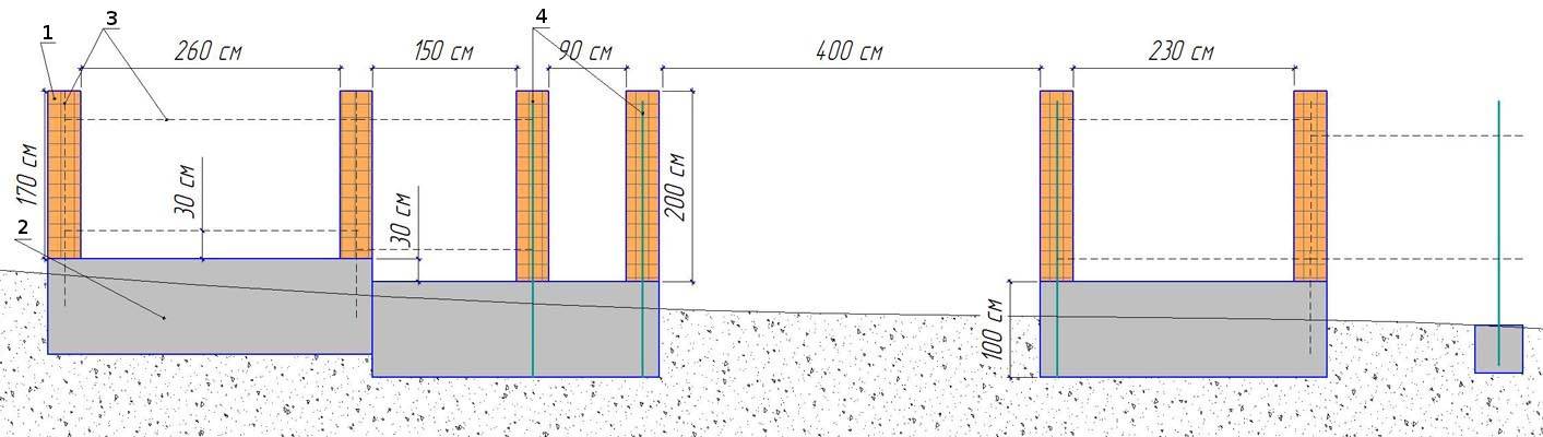Конструкция забора с кирпичными столбами на монолитном железобетонном фундаменте