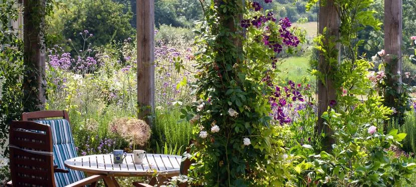 Опора, увитая цветущим клематисом, помимо того, что выступает нарядным элементом украшения любого сада, помогает разделить пространство на отдельные функциональные зоны