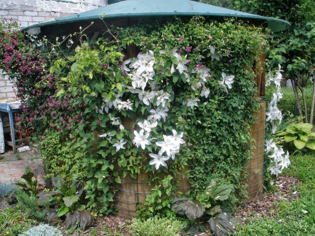 беседках. Любые вьющиеся растения способны преобразить внешний вид садовой беседки, и сделать ее похожей на сказочную. Клематисы, пущенные по стенам беседки, создадут в ней особую атмосферу тепла и уюта, а также защитят отдыхающих от жары, сквозняков и любопытных глаз. Здесь можно высадить растения любых цветов: красные, сиреневые, лиловые, фиолетовые, голубые, кремовые, белые или шоколадные. К тому же, растение пущенное по беседке, будет быстро разрастаться за счет хорошей циркуляции воздуха в кроне и защите корней от перегрева;