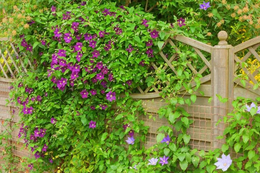 заборах. Если речь идет о даче, где установлено ограждение в виде сетки рабицы, то скрыть участок от посторонних глаз и придать ему загадочности и нарядности можно благодаря вьющимся клематисам. Это растение довольно быстро создаст пышную живую изгородь, украсив собой не только ограждение, но и весь двор;