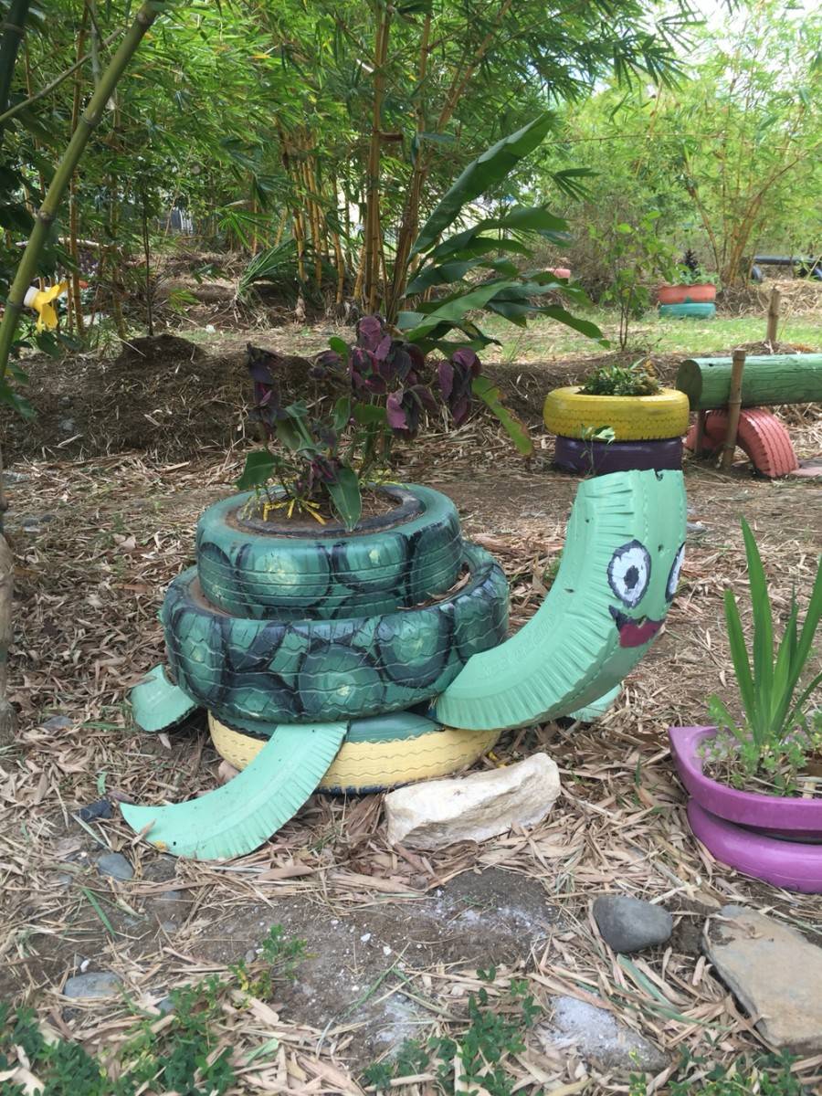 Весёлая черепашка. Для ее создания необходимо надрезать шину в 4-х местах, затем вставить в них вырезанные из другой шины лапки. Голову изготавливаем из 1,5 л пластиковой бутылки. Красим изделие. Такую поделку можно использовать в качестве цветочной клумбы.