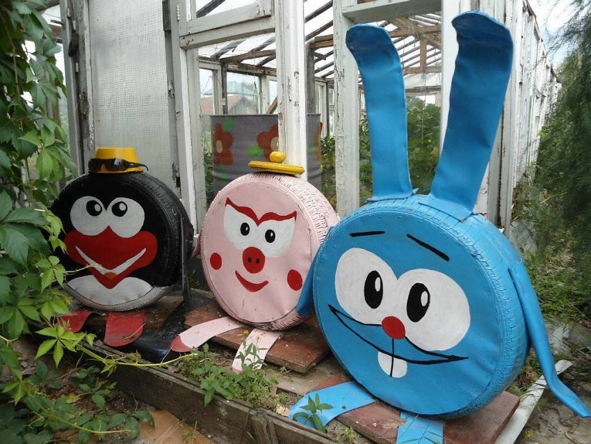 Декорируя покрышки вспомогательными элементами в виде лапок, глаз, мордочек зверей, можно создать различные вазоны для детской площадки или использовать их в качестве садовой скульптуры. Несколько таких покрышек, уложенных друг на друга в виде колонны или горки, окрашенные в яркие цвета, создадут вертикальную композицию
