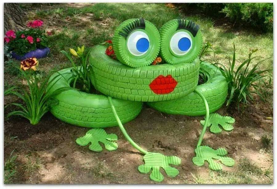 Именно глиняные лягушки очень часто украшают дачные участки. Зеленые красавицы идеально вписываются в садовый антураж. Но и лягушки из резиновых покрышек будут выглядеть также неординарно.