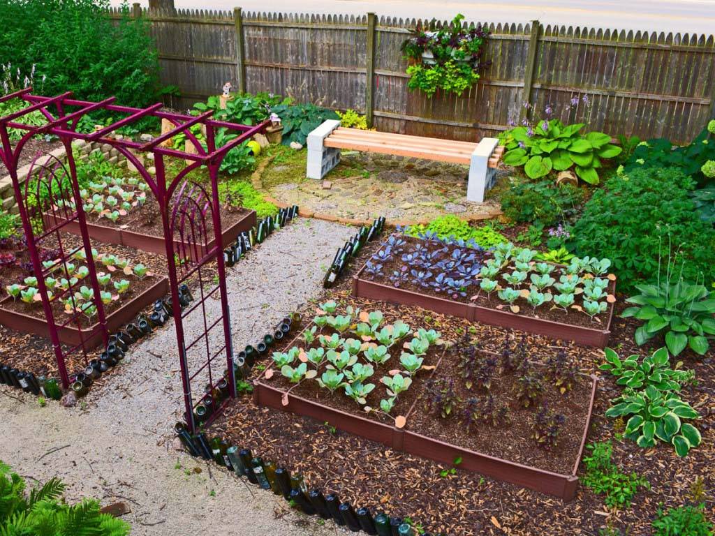 Ещё один не менее простой и эффектный вариант украшения — из декоративного бордюра. По такому же принципу собирается многоярусная грядка из обычного кирпича.