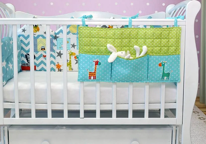 Отличным украшением послужит органайзер для хранения подгузников, пеленок, салфеток, бутылочек. Все самое необходимое всегда будет под рукой. Его можно сшить самому и подвесить на стене, к спинке кроватки, пеленального столика или оставить подвешенным свободно, прикрепленным к потолку, например. Идея сделать его в форме забавной мордочки животного или сказочного героя придаст интерьеру позитивный и веселый атмосферный настрой.