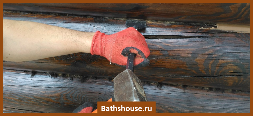 Перед тем, как приступить к основным работам, внимательно осматривают швы бани. Если конопачение проводится не в первый раз, то убирают старый, прогоревший, подгнивший утеплитель. Для конопатки сруба шнурами, канатиками предварительно замеряют максимальную просадку венцов, чтобы определить равномерность усадки строения.