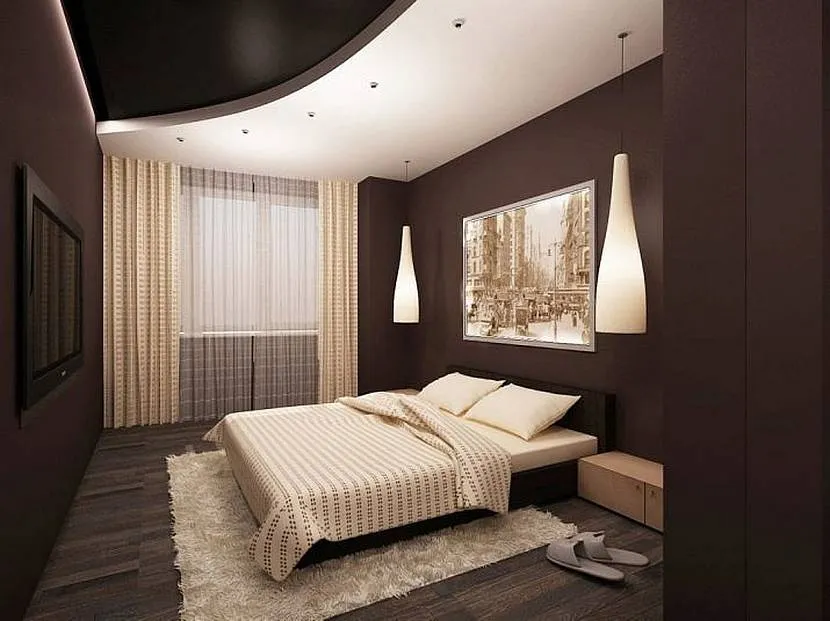В большой комнате дизайнеры разрешают использование темного заднего плана и светлой мебели. Бежевая кровать смотрится очень большой и парящей над полом. Сочетание коричневых и песочных стен позволяет визуально корректировать неправильность вытянутой (прямоугольной) спальни.
