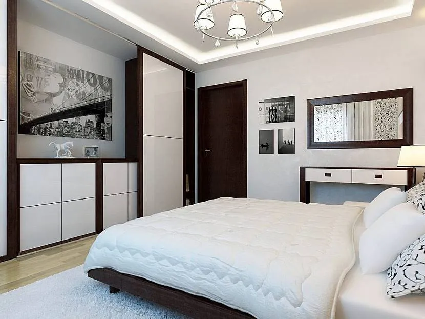 Темное оформление стен коричневой спальни с белыми фасадами смотрится эффектно и ярко. Снежные предметы интерьера оптически добавят пространству освещения, как окна. Кофейной можно оформить одну акцентную поверхность в зоне с кроватью.