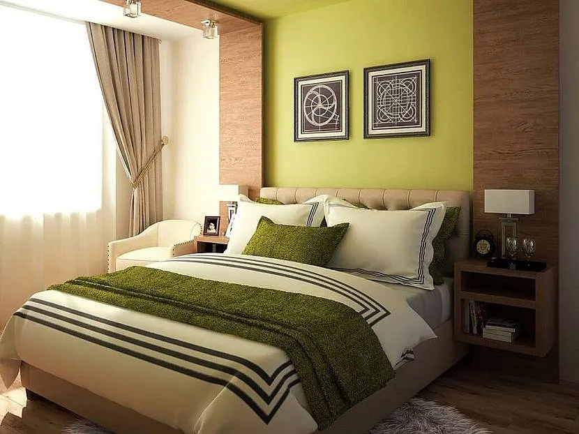 Темная спальня в коричневых тонах эффектно выглядит с фоном, выполненным в сочных природных оттенках. Пространство психологически воспринимается свежим, чистым и естественным. Полупрозрачные бледные цвета (фисташковый, серый мох) более выигрышны, чем белый или бежевый. Интерьер получается живым, объемным и подвижным.