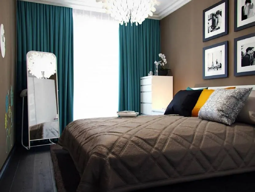 Один из самых удачных дуэтов. Комбинация теплого кофейного и цвета морской волны привносит в интерьер атмосферу изнеженной роскоши. Сочность темного коричневого подчеркивает благородный бирюзовый. Теплоту или холодность дизайна корректируют основным фоном. В просторной спальне можно использовать шоколадное оформление. В компактном уместны прозрачные оттенки сине-зеленого.