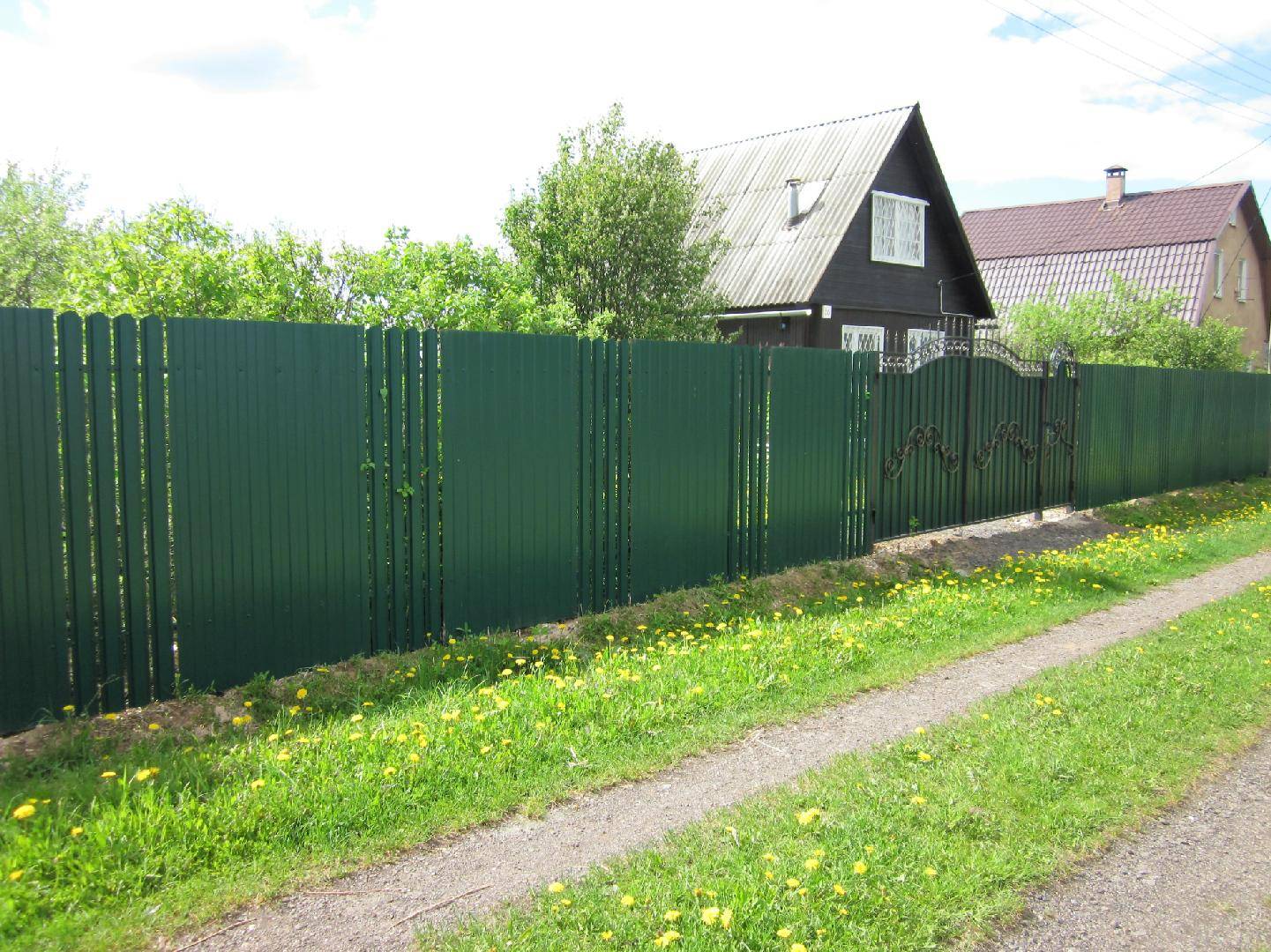 - Если крыша дома выполнена из профнастила, то забор из этого же сырья будет смотреться очень гармонично.