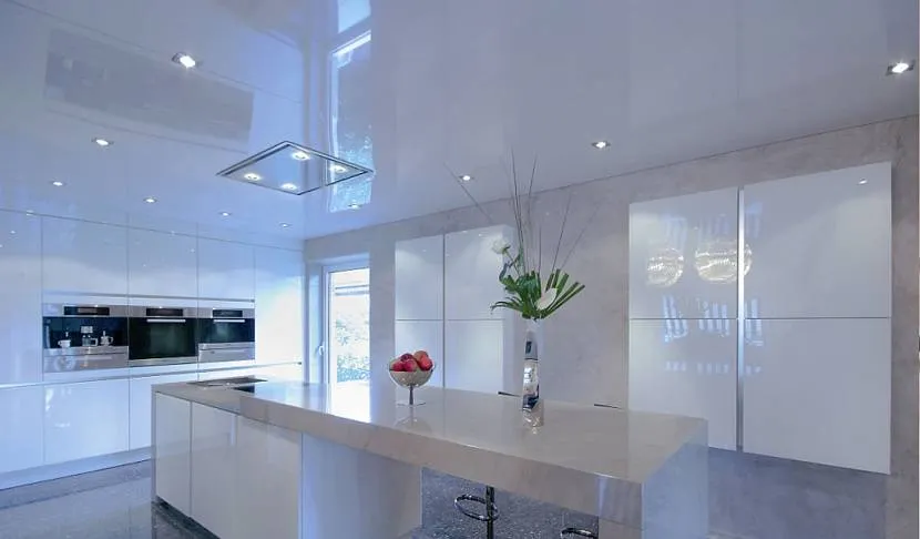 Для кухни дизайнеры рекомендуют применять глянцевые покрытия с хорошей светоотражающей способностью. Такой цветной потолок, где будут отражаться предметы интерьера, сделает помещение колоритным, визуально увеличит объем, прибавит красок.