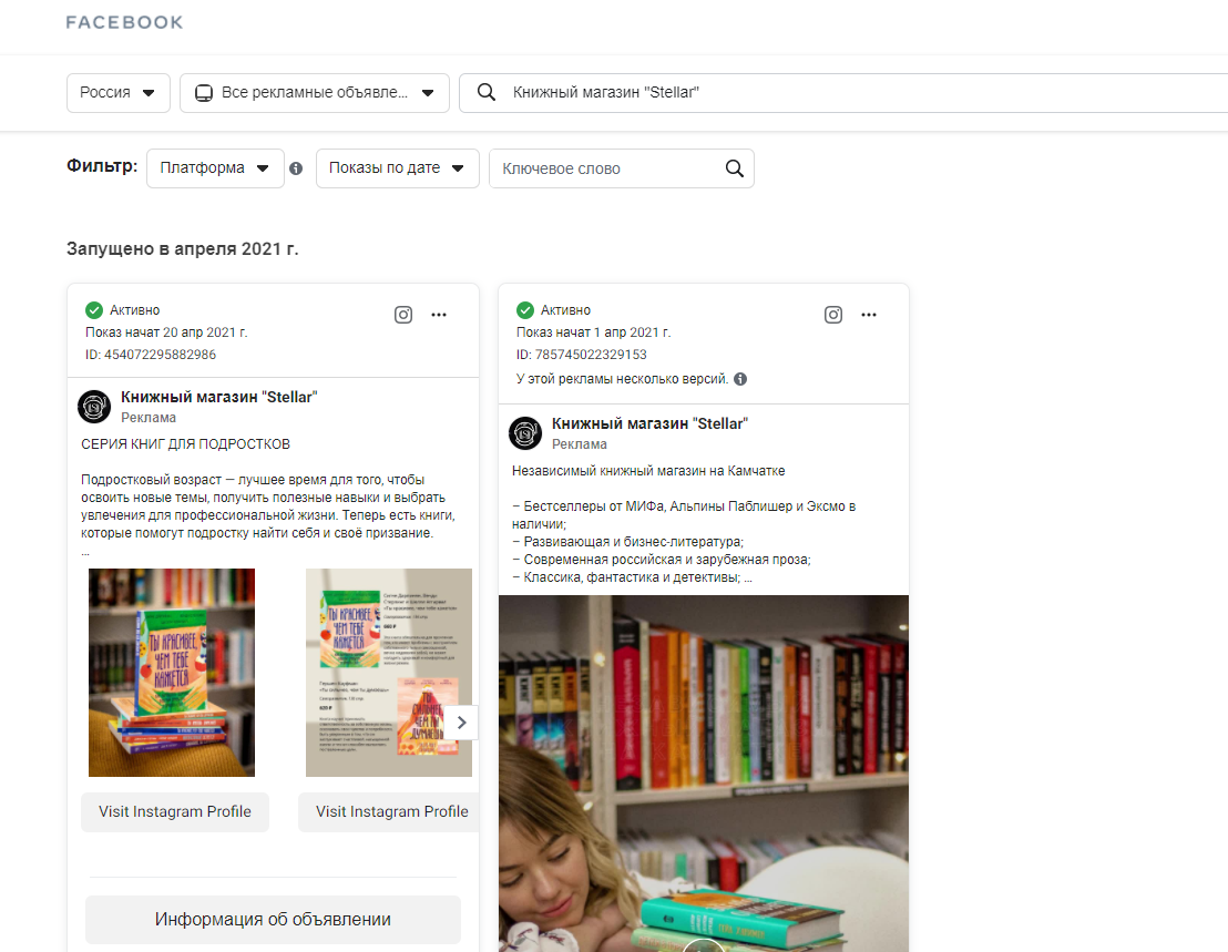 Можно отфильтровать рекламу по дате запуска, платформе (Facebook, Instagram, Audience Network, Messenger), а также ввести дополнительные ключевые слова для поиска нужных объявлений. А нажав под объявлением кнопку «Информация об объявлении» вы увидите дополнительные сведения о рекламе, например, другие версии этой рекламы, если они есть.
