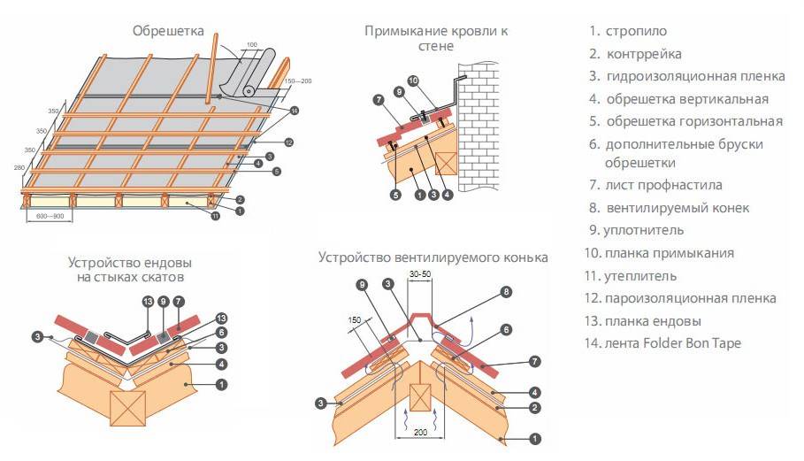 Для обрешётки обычно используют рейки 30×40 мм. Их начинают набивать горизонтальными рядами от карниза к коньку с шагом 500-1000 мм, в зависимости от угла наклона крыши. Сращиваются рейки только на стропилах. Для всех этих работ используются оцинкованные гвозди. Длина гвоздей должна быть в 2 раза больше толщины рейки обрешетки. Желательно на коньке и на карнизном свесе крыши сделать сплошную обрешетку, в местах выхода труб, на ендовах необходимо набить дополнительные бруски, к которым уже потом будут крепиться дополнительные материалы для их оформления. В идеале схема кровли профнастилом в разрезе выглядит вот так:
