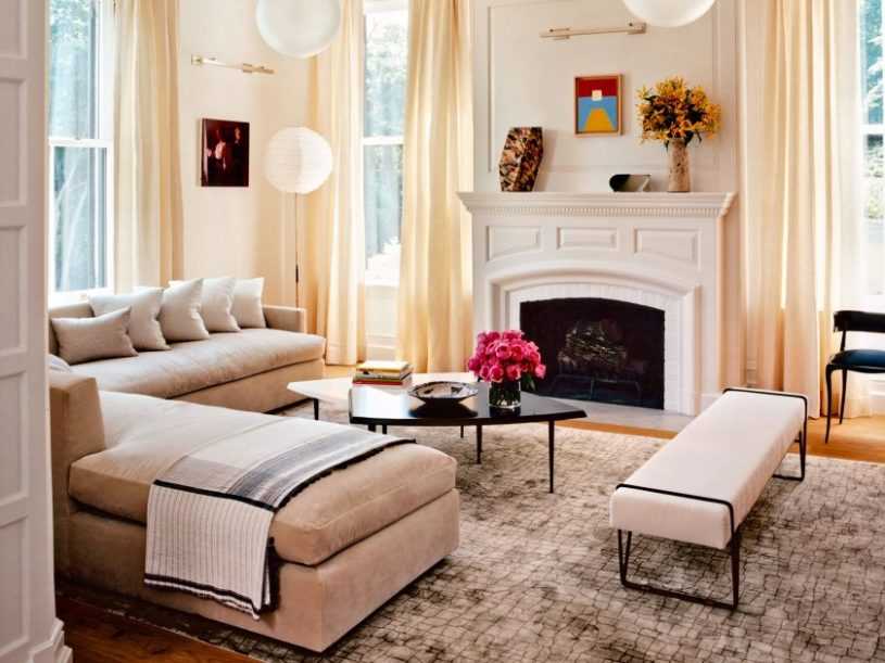 Разрабатывая дизайнерский проект для узкой гостиной с камином в квартире, следует проявить внимательность и не перегружать помещение лишними предметами мебели. Оформляя каминную зону, следует обеспечить безопасное расстояние мягкой мебели и ковров до открытого огня. Оно не должно быть меньше полутора метров.