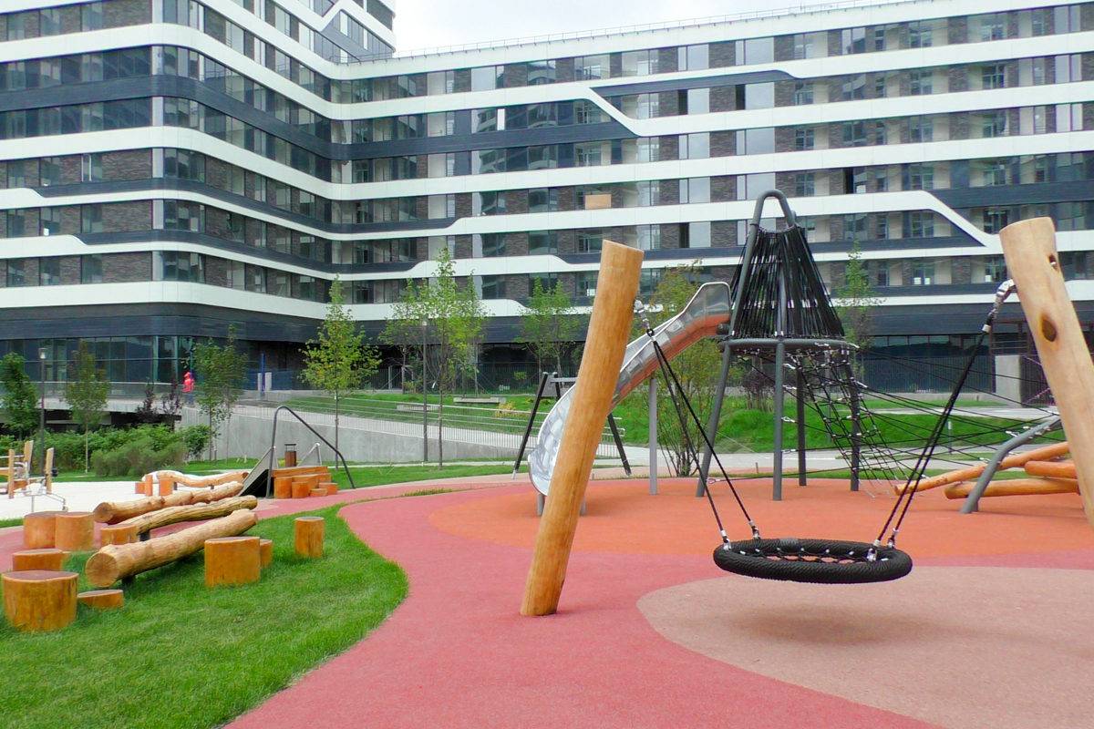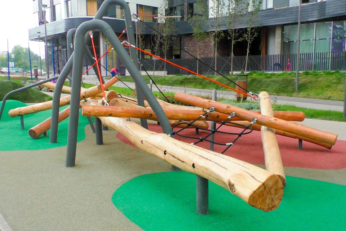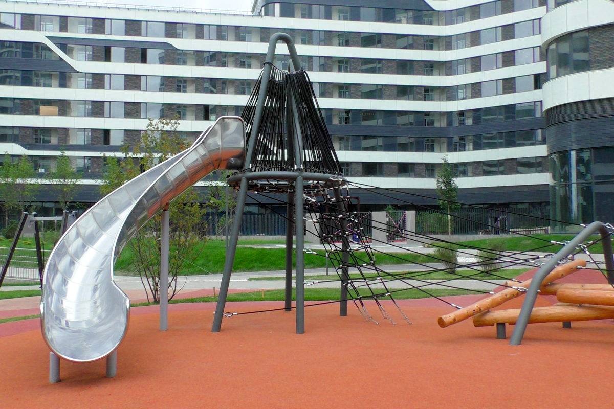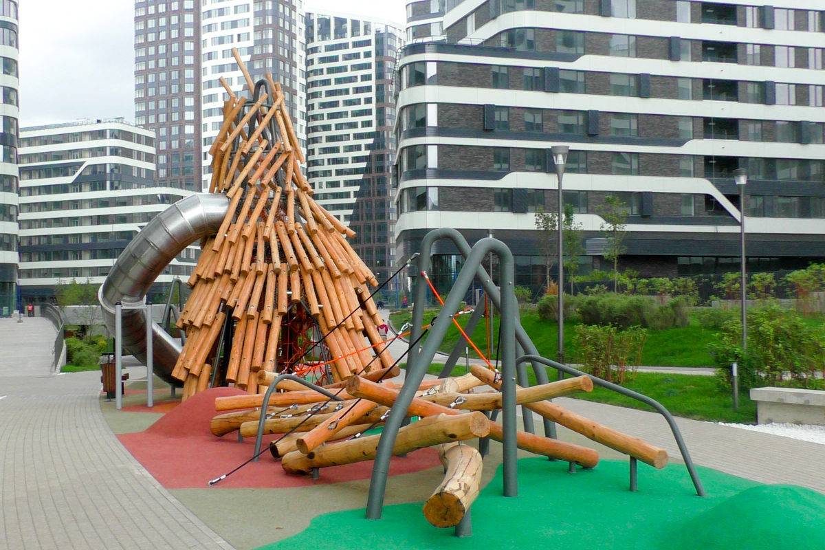 В первых числах августа 2019 года в Москве открылась еще одна парковая детская площадка. Примечательна она тем, что стала частью большой реконструкции бывшей промзоны «Серп и молот» на юго-востоке столицы. Пока здесь открыт только первый участок городского парка, уже получившего название «Зеленая река». Полностью зона отдыха общей площадью 10 га будет благоустроена к 2025 году. Но даже и тех 2 га, что уже доступны для прогулок, достаточно, чтобы приехать сюда с детьми. Необычная площадка для детских игр похожа на зону пикника для великанов. Горка в виде нарочито наваленных в виде пирамиды бревен, веревочные перетяжки-препятствия, качели-гнезда и батуты. Без сомнений, это она из самых необычных с точки зрения дизайнерских решений детских игровых зон под открытым небом. Кстати, над проектом парка и площадки трудились дизайнеры из именитых креативных бюро LDA Design и UHA London.