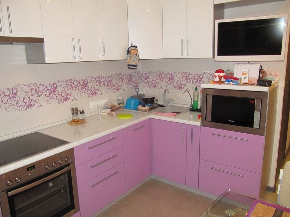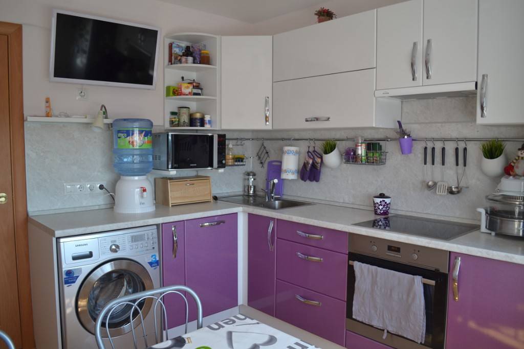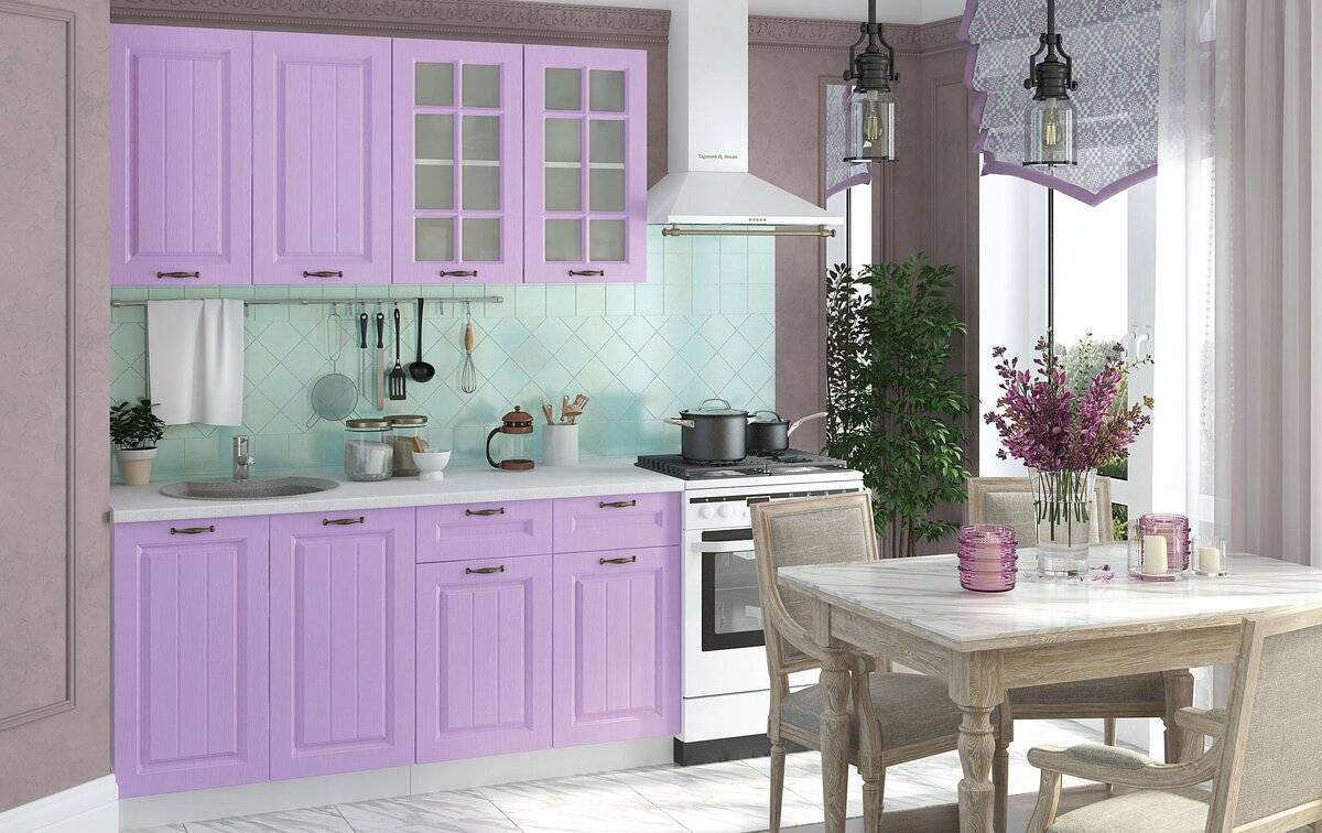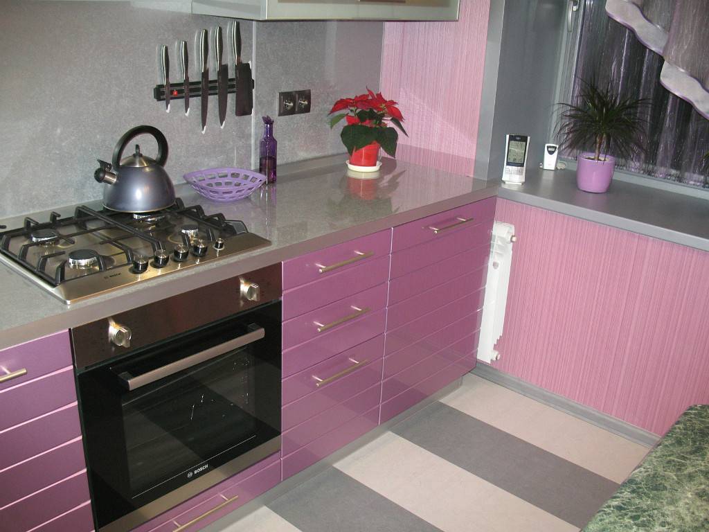 Хорошей идеей станет также столешница или фартук в фиолетовом оттенке, они послужат фокусной точкой, но тогда стены и гарнитур лучше сделать в другом цветовом варианте.