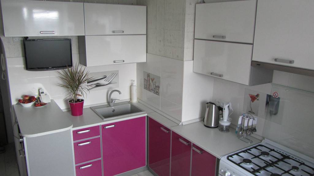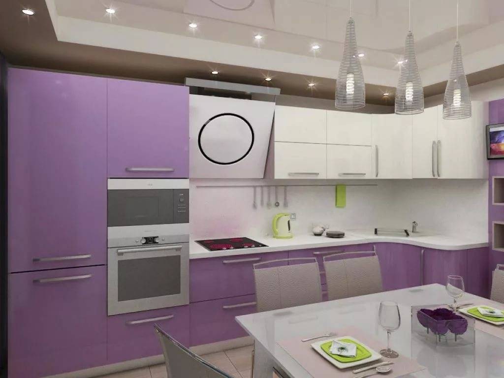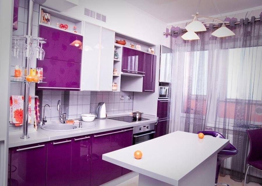 Белый и фиолетовый являются наилучшим вариантом в создании спокойной, расслабляющей и в то же время яркой и контрастной обстановки. Эффектно дополнят такой интерьер элементы из стали, в виде бытовой техники, раковины из нержавейки, серебристых ручек и прочего. Наиболее удачным решением будет комбинировать белый верх и фиолетовый низ в оформлении гарнитура.