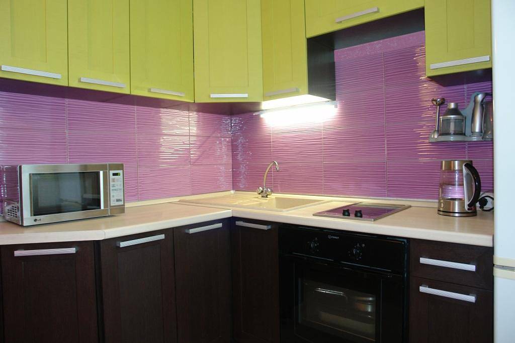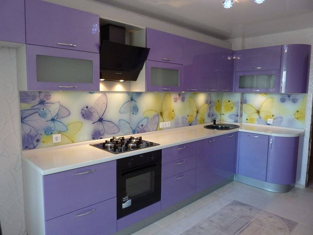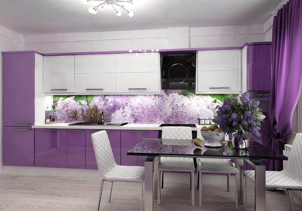 Яркий сиреневый фартук привлекает внимание к рабочей зоне и оживляет интерьер. Для фартука можно использовать как плитку или стекло подходящего однотонного оттенка, так и фотопечать с яркими фиолетовыми элементами на стеклянном фартуке