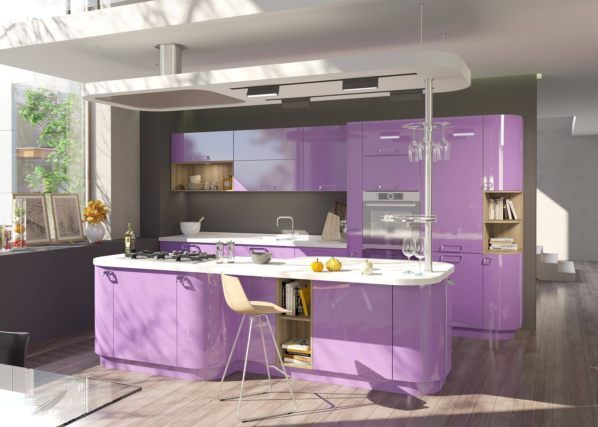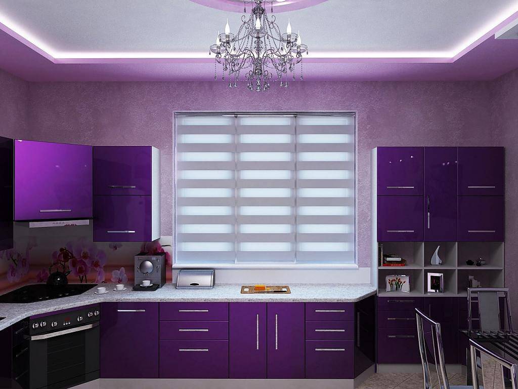 Черничный или фиалковый тон, который сочетается с черными блестящими глянцевыми или матовыми поверхностями, прекрасно дополнит интерьер просторной кухни с качественным освещением.