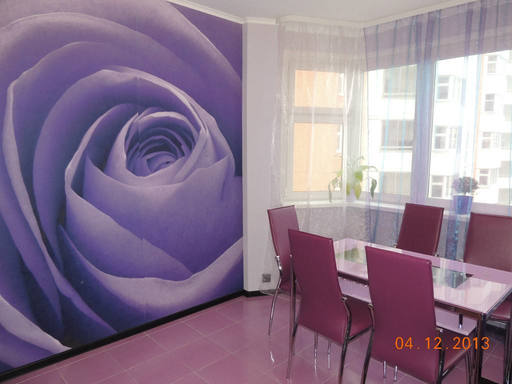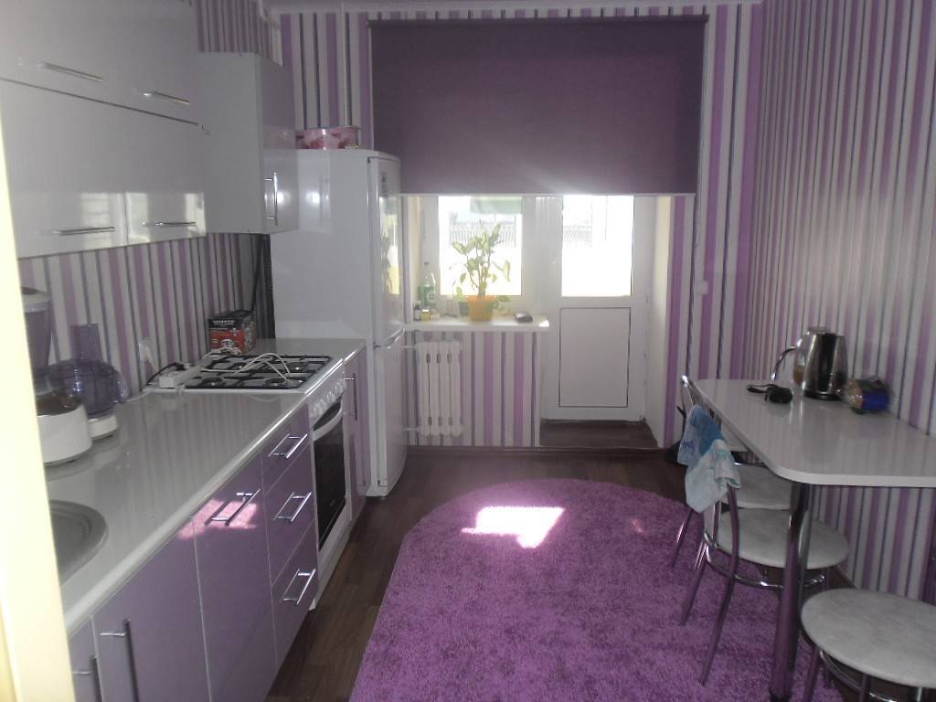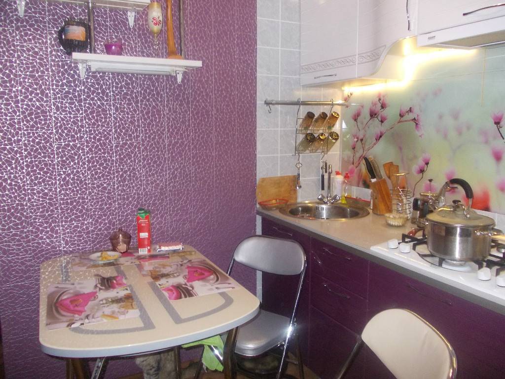 Если выбираете фиолетовые обои, то стена, оклеенная ими, должна быть только одна, иначе рискуете получить пещеру вместо кухни, так как баклажановый имеет свойство «сжимать» помещение. Если остальные три стены сделать белыми, то получится весьма эффектное и современное дизайнерское решение.