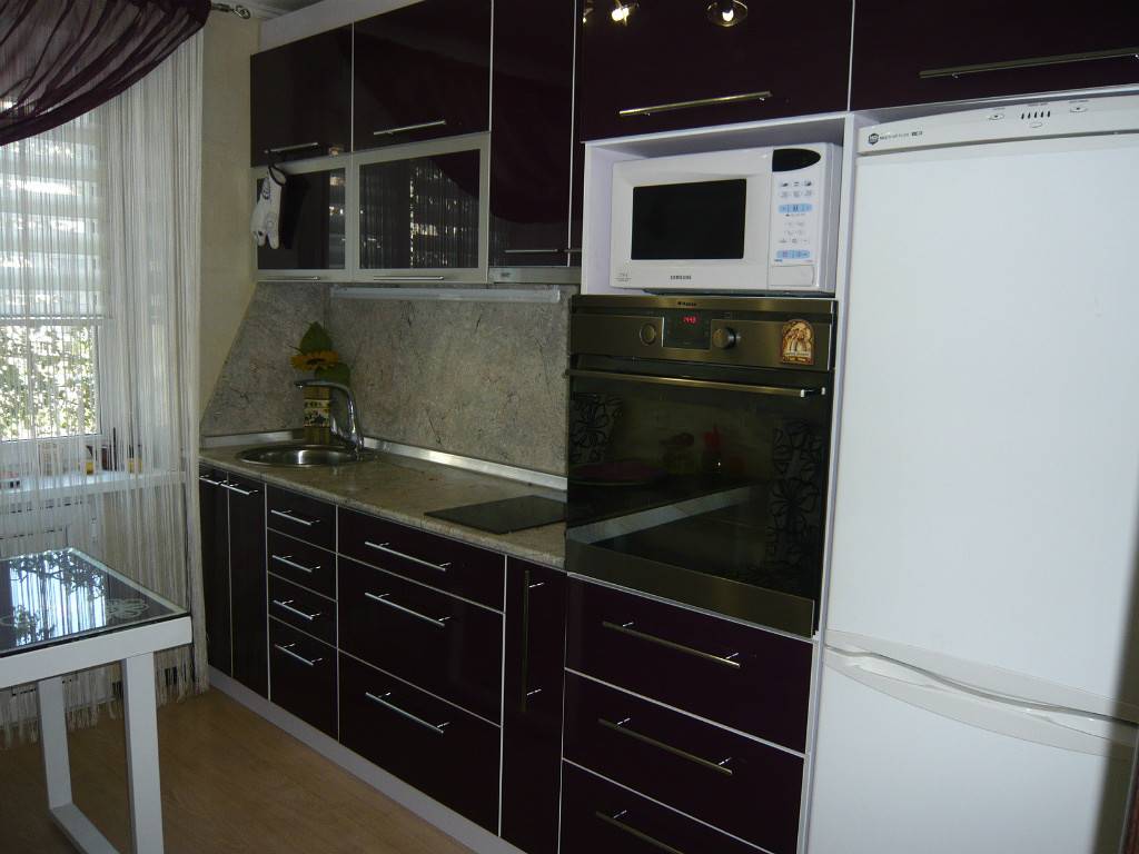 Для кухни баклажан, как главный цвет палитры, вполне подходит. Он допускает и глянец, и матовую поверхность и комбинируется с большим количеством оттенков. На фото представлен дизайн кухни с глянцевым фасадом.