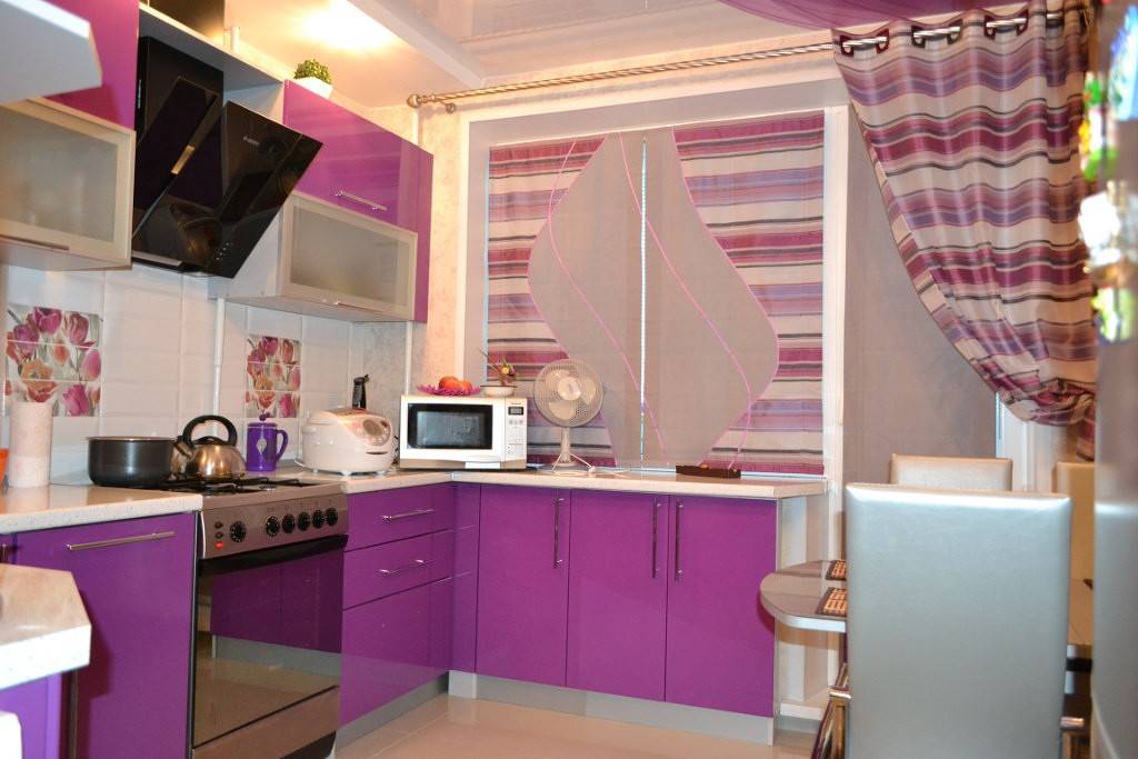 В случае если обстановка смотрится слишком мрачно, в нее добавляют светлые или пастельные вкрапления, в виде декора. Черно-фиолетовый гарнитур особенно выгодно оттенит фартук белого цвета, мойка из нержавейки и холодильник с микроволновой печью в идентичном исполнении.