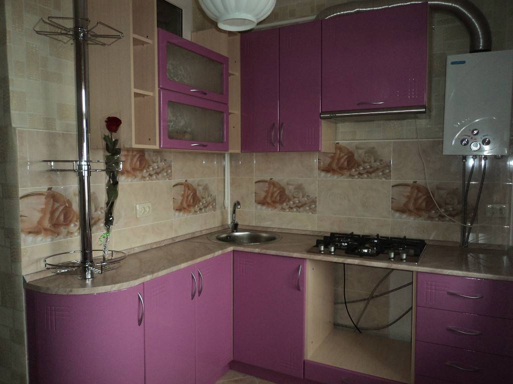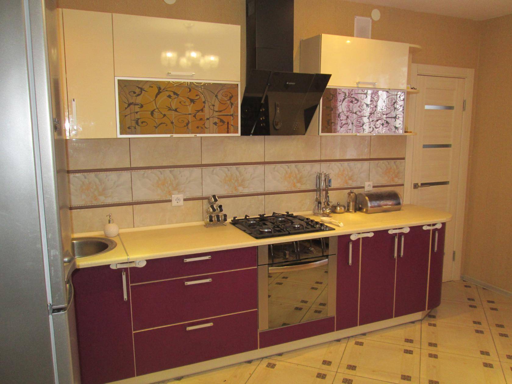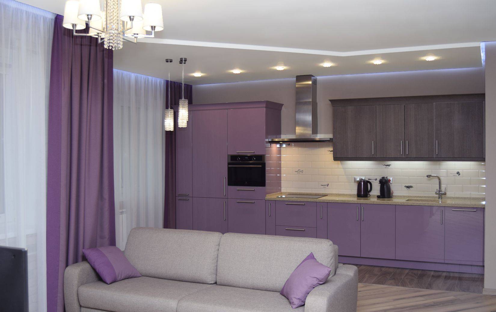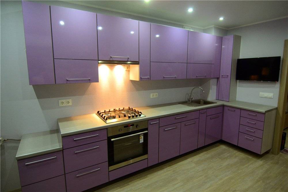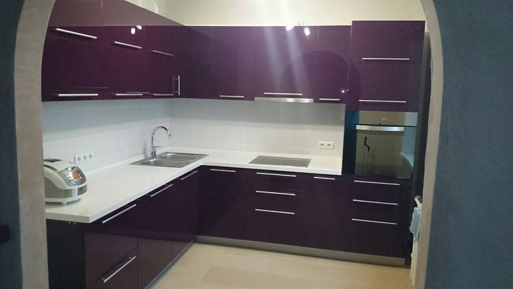 Наиболее удачно смотрится мебель баклажанового цвета с глянцевым фасадом. Но если выбрали такую мебель, то отделка должна быть другого цвета, и наоборот — фиолетовую отделку нужно разбавить светлой мебелью.