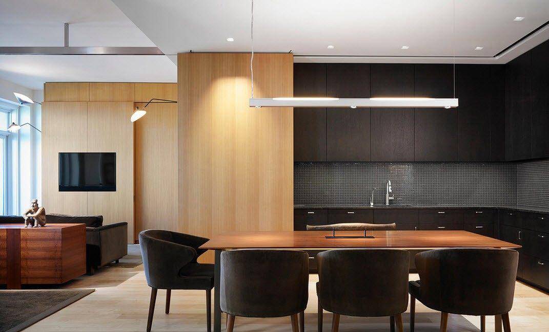 При освещении кухни важно выделить обеденную зону, здесь обычно используют красивые мощные подвесные светильники