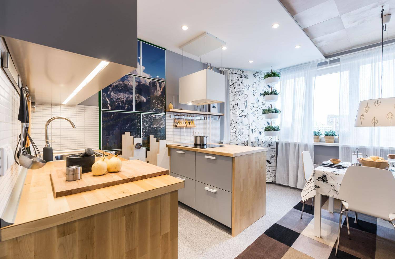 Полуостров – это тот же стол-остров, только упирается одним торцом в стену, за счет чего становится компактнее и оставляет достаточно места для обеденной зоны. Его можно оснастить раковиной или плитой, но чтобы не усложнять ремонт кухни, проще всего использовать полуостров лишь для подготовки продуктов, хранения утвари и перекусов. Также в него можно без проблем встроить винный шкафчик или маленький холодильник/морозильник. Кстати, полуостров особенно актуален для кухни в квартире-студии, так как сможет разделить собою пространство на кухонную и столовую/гостиную зоны. В следующем же фото-слайдере представлен пример дизайна 15-метровой кухни с эркерным окном и двумя функциональными секциями.