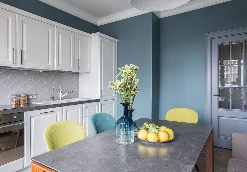 При удачном сочетании белого и синего цветов кухонное помещение, даже с установленной коробкой вентиляции, выглядит достаточно просторным.