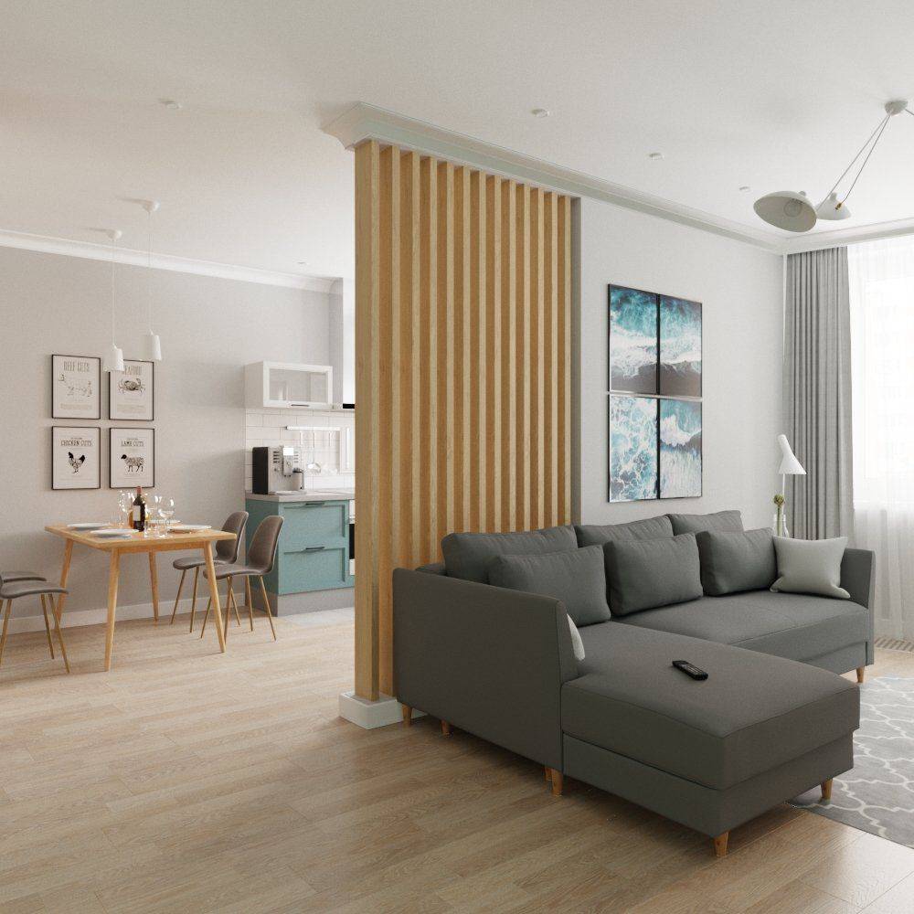 Для большинства семей самое оптимальное решение – распределить место между кухней и гостиной примерно поровну. При этом способы зонирования могут быть как капитальными (требующими немалых финансовых затрат), так и временными, недорогими. Посмотрим, какие есть варианты