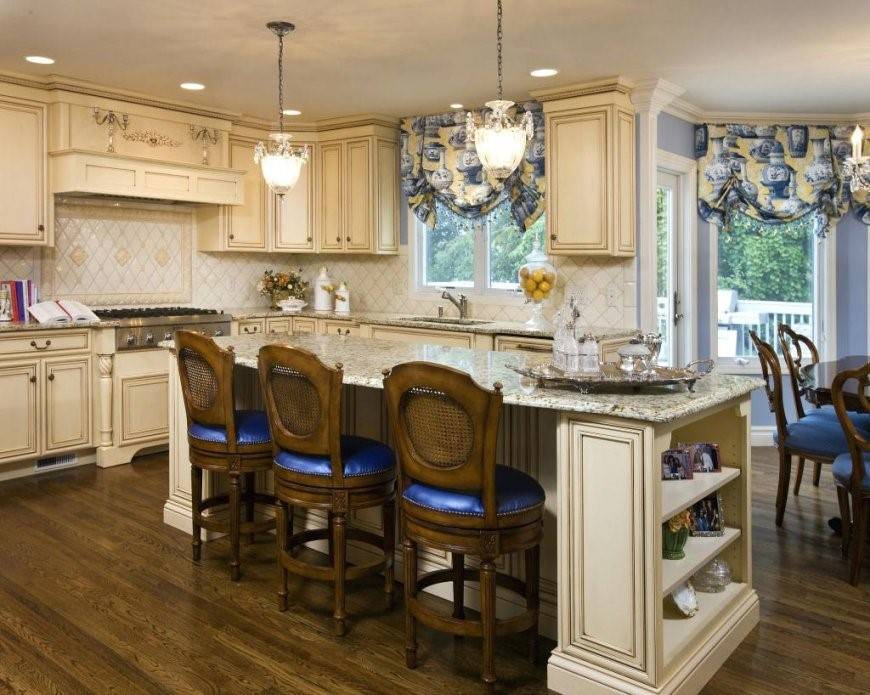 Освещение кухни должно быть традиционным, без модного точечного освещения. Подумайте о классической массивной хрустальной люстре, нескольких лампах, размещенных в разных зонах, и стоячий светильник для локального мягкого света.