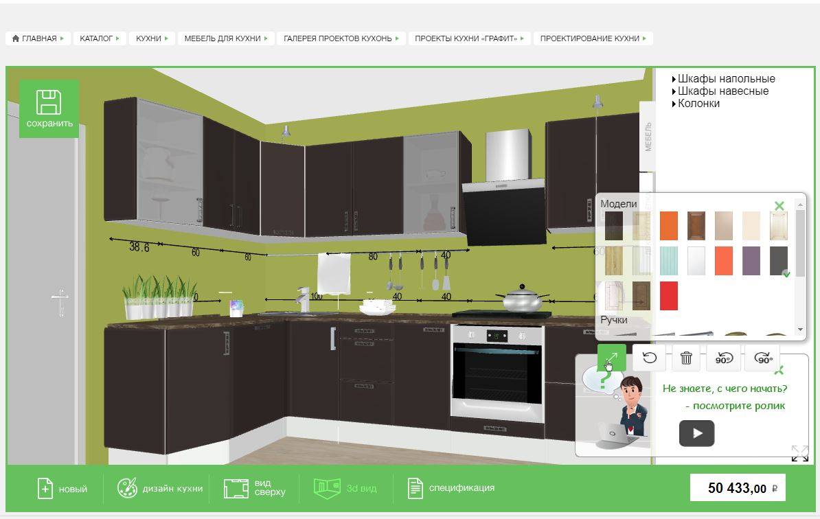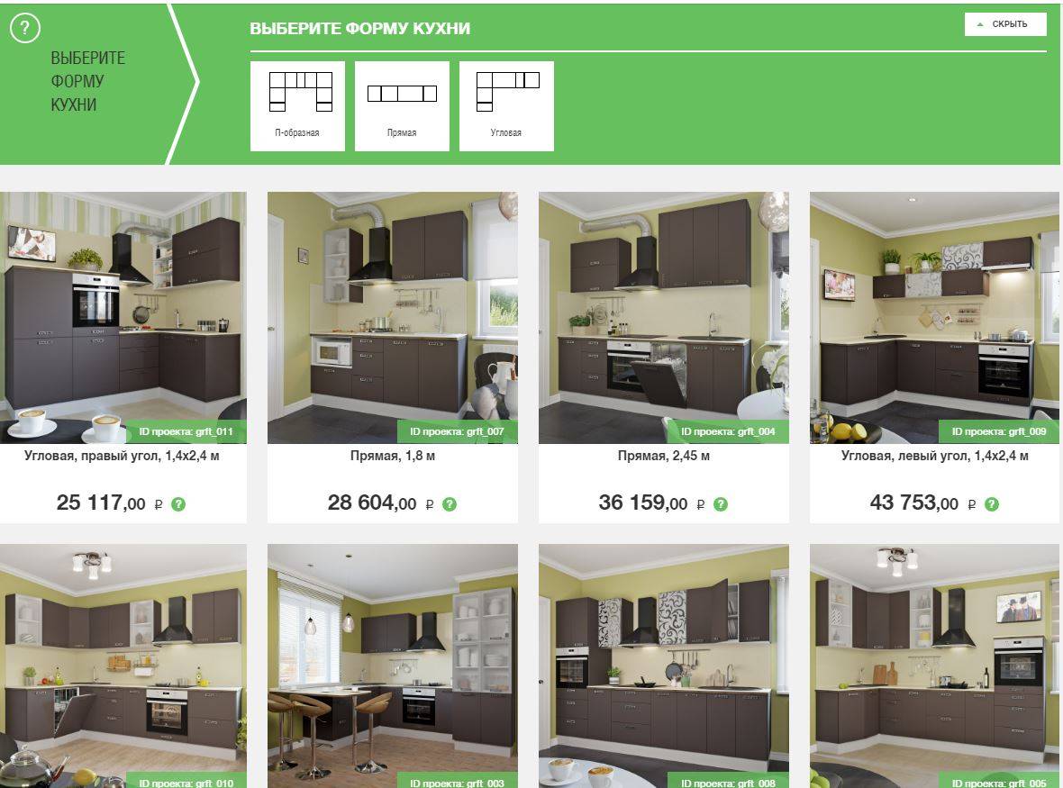 Покупатели могут выставить в конструкторе не только существующие модели, но и рассчитать размеры, выбрать форму кухни. Они бывают прямыми, угловыми, П-образными, есть отдельно варианты для семей, где есть люди с ограниченными возможностями.
