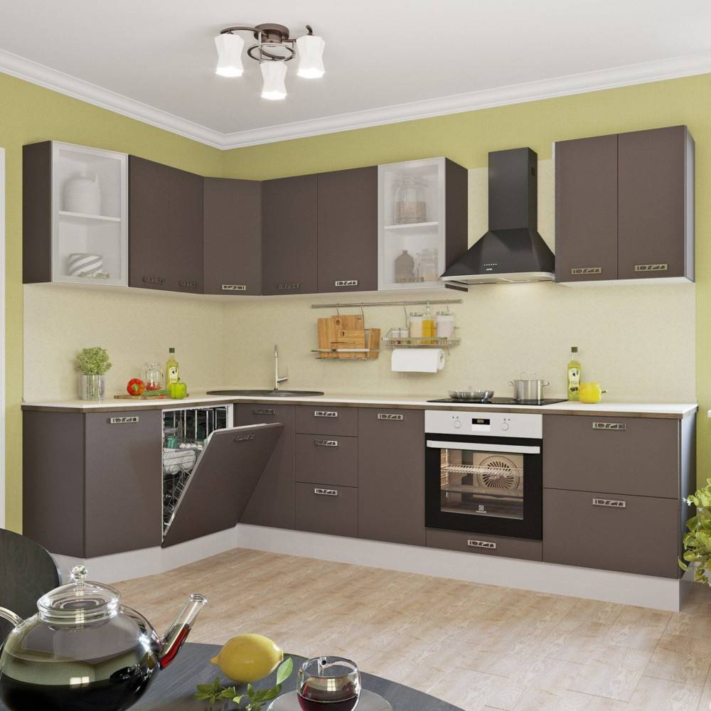 - Угловая кухня – самое распространенное размещение, так как позволяет с наименьшими затратами сформировать «рабочий треугольник». В Леруа Мерлен можно найти угловые модули разного вида – трапециевидные и Г-образные, что, в свою очередь, позволяет варьировать положение мойки.