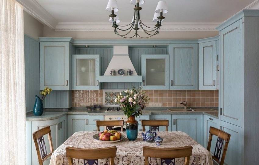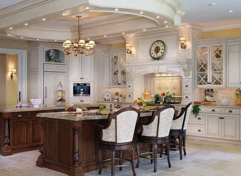 Потолок выполняется в белом цвете или близких ему вариациях. Предпочтительно умеренное декорирование лепниной: потолочными карнизами, розетками, молдингами. Они добавляют небольшой орнамент на потолки, сочетающийся с общим дизайном кухни. В малогабаритных помещениях использование лепнины и дополнительного декора на потолках не рекомендуется. Здесь достаточно будет не слишком широкого карниза.