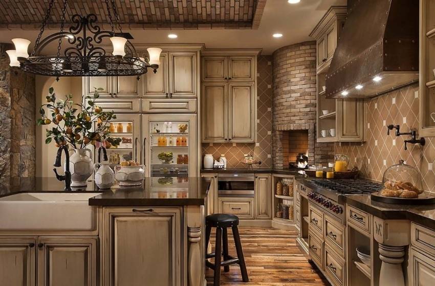 - Материалы используются только дорогие и натуральные – обычно это камень, древесина, керамика, или в крайнем случае МДФ. Мебель из массива дерева или МДФ, пол и столешница из натуральной породы, фартук из керамики. Обои только бумажные или текстильные. Применимы фотообои с рустикальным сюжетом, с античными изображениями, с библейской росписью.