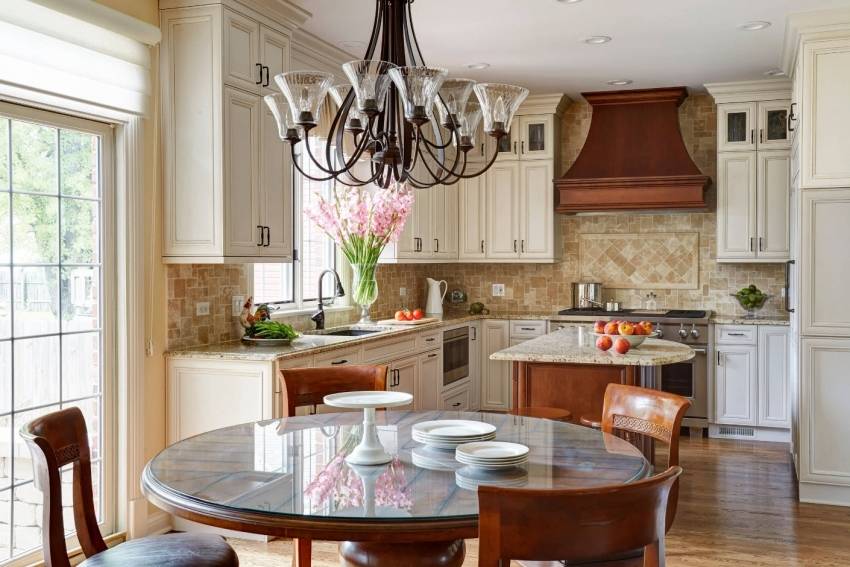 Классика требует симметрии и четкого разграничения пространства. Поэтому нужно заранее продумать всю композицию. В больших кухнях часто можно увидеть, что гарнитур располагается буквой L, а обеденная зона выносится в центр помещения.