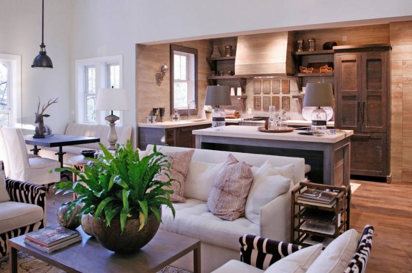 Зонировать помещение можно с помощью двухуровневого потолка, либо специально подобранного освещения. Обеденный стол не должен быть слишком массивным, отличным решением станет установка круглого стола в углу кухни.