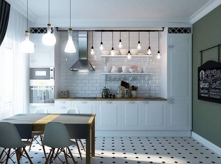 Окна и осветительные приборы для кухни в скандинавском стиле