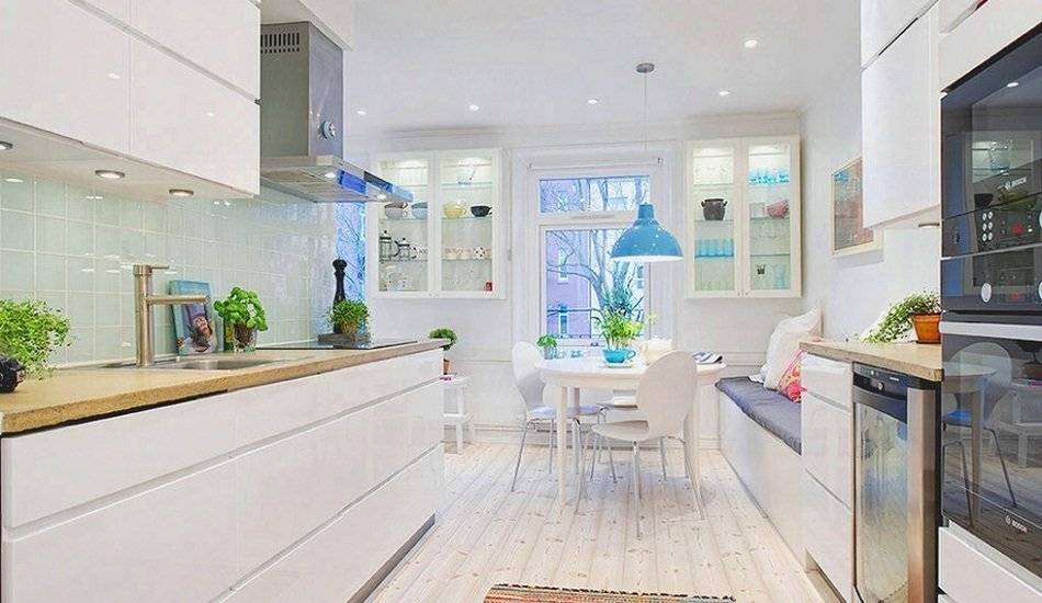 Эталон: белый потолок, гладкие светлые поверхности, белоснежный или яркий фартук и пол под выбеленное дерево или плитку. Функциональная мебель и изобилие освещения – это то, что придает кухне особый уют и тепло.