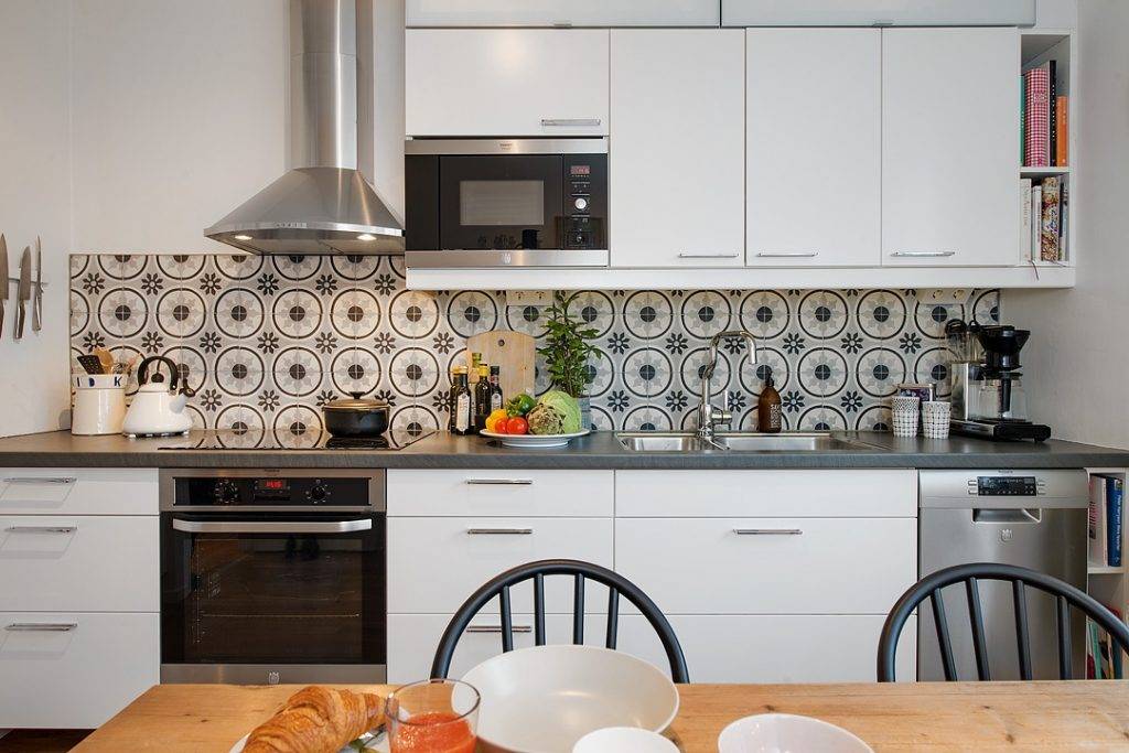 Кухонный фартук для дизайна кухни в скандинавском стиле обычно делают белым в тон помещению или выбирают яркие решения с узорами, примеры на фото.