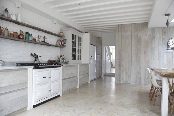 Традиционный скандинавский стиль на кухне начинается с оформления поверхностей, где немаловажную роль играют два нюанса – материал и цвет. Жители Северной Европы с особым трепетом относятся ко всему натуральному, особенно – к древесине, с удовольствием используя этот материал в интерьере своих домов. Поверхность стен, пола и потолка в аутентичной кухне Скандинавии может полностью облицовываться деревом – доской, ламинатом, панелями и т.д. Причем предпочтение отдается древесине светлых пород, которая дополнительно может покрываться белой краской. Однако окрашивание производится таким образом, чтобы сквозь слой краски просвечивалась деревянная фактура.