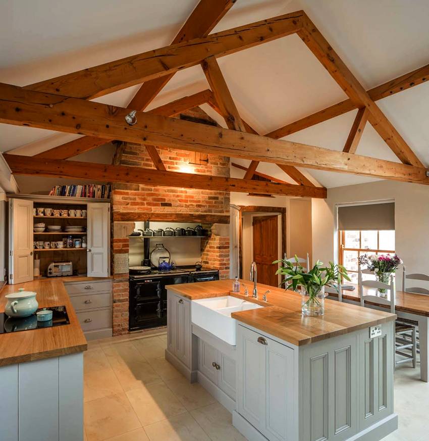 А на этой кухне правит дерево различных оттенков, вот оно в отделке потолка, потолочных балках, кухонном гарнитуре, декоре вытяжки
