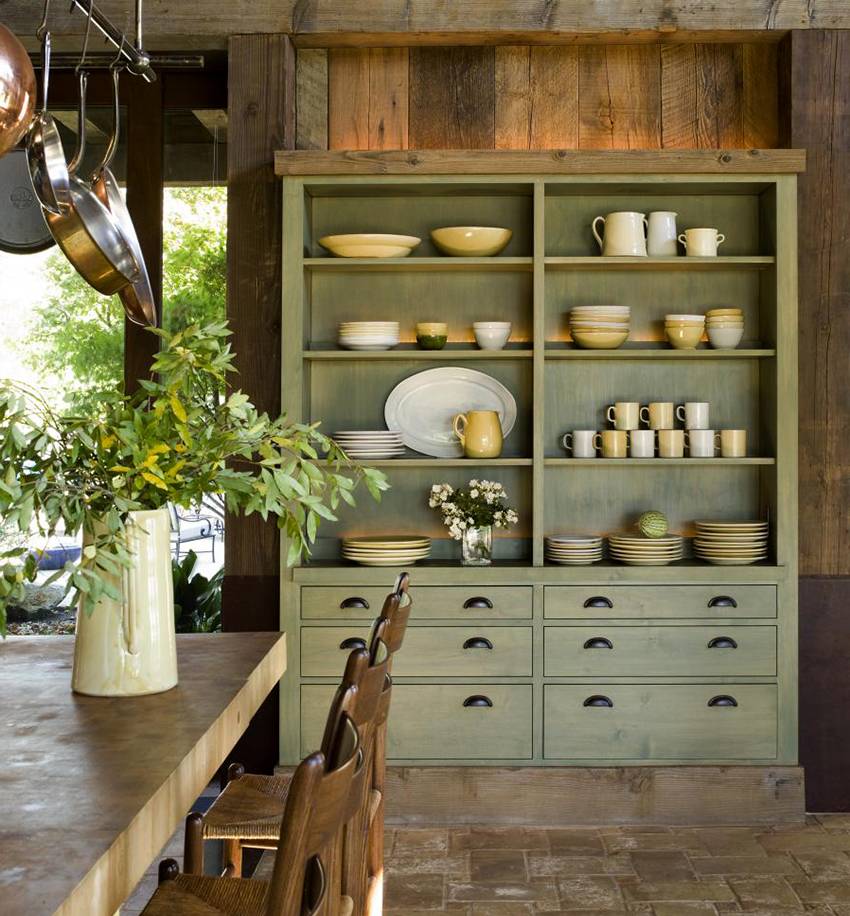 Кухонная утварь должна где-то храниться. Обычно ее стараются спрятать за закрытыми дверцами шкафов. Стиль кантри не требует этого. Здесь вполне допустимо размещать кастрюли, керамическую посуду, хрусталь на открытых полках. Но все же стеклянные дверцы не помешают, так как уберегут посуду от оседания на нее пыли.