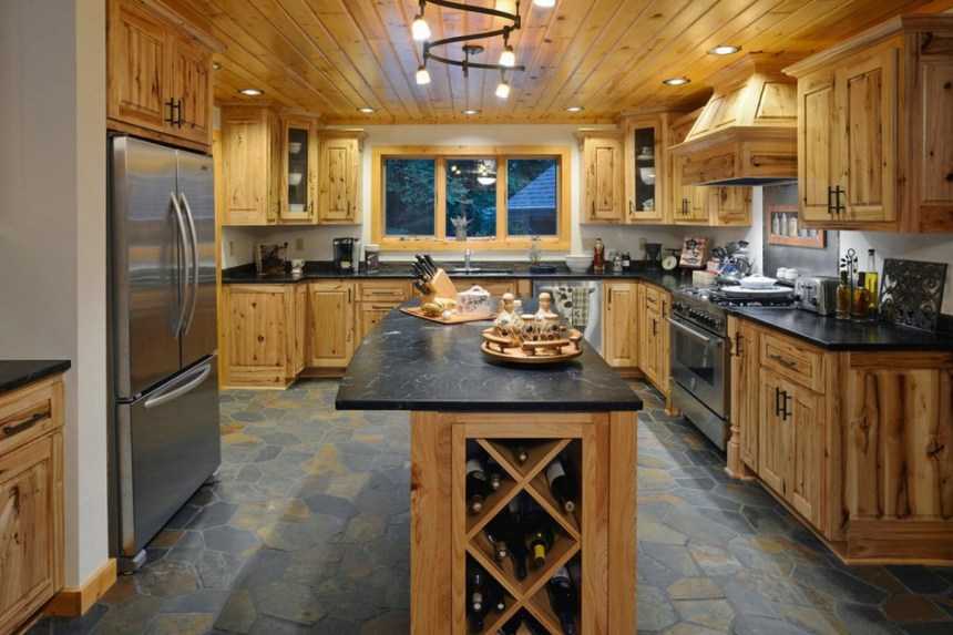 Камень можно использовать только для отделки пола и оформления столешницы. Такой вариант наиболее уместно будет выглядеть на кухне, облицованной деревянными панелями или вагонкой.