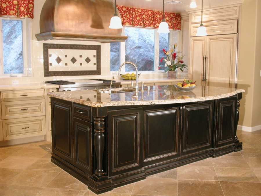 - рабочая кухонная зона требует особого ухода и возможности частой уборки. Как правило, зона в районе плиты и мойки всегда укладывается кафельной плиткой (как на стенках, так и на полу). Для кухни кантри придется выбрать стилизованные вариации плиточного покрытия (с украшением старинными узорами, с орнаментом, с использованием эффекта старения, имитации потертостей и трещинок);