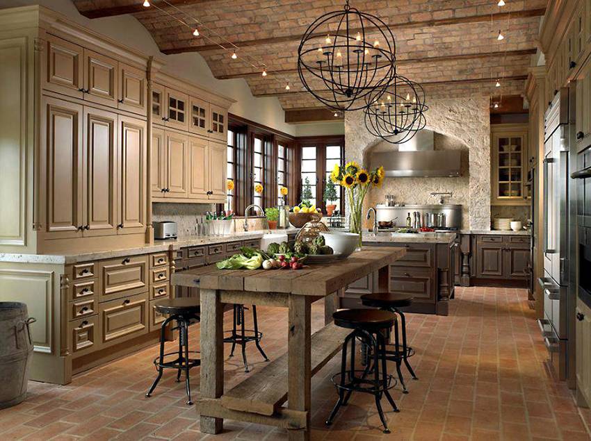 Камень используется для облицовки стен, пола и потолка в кухнях кантри