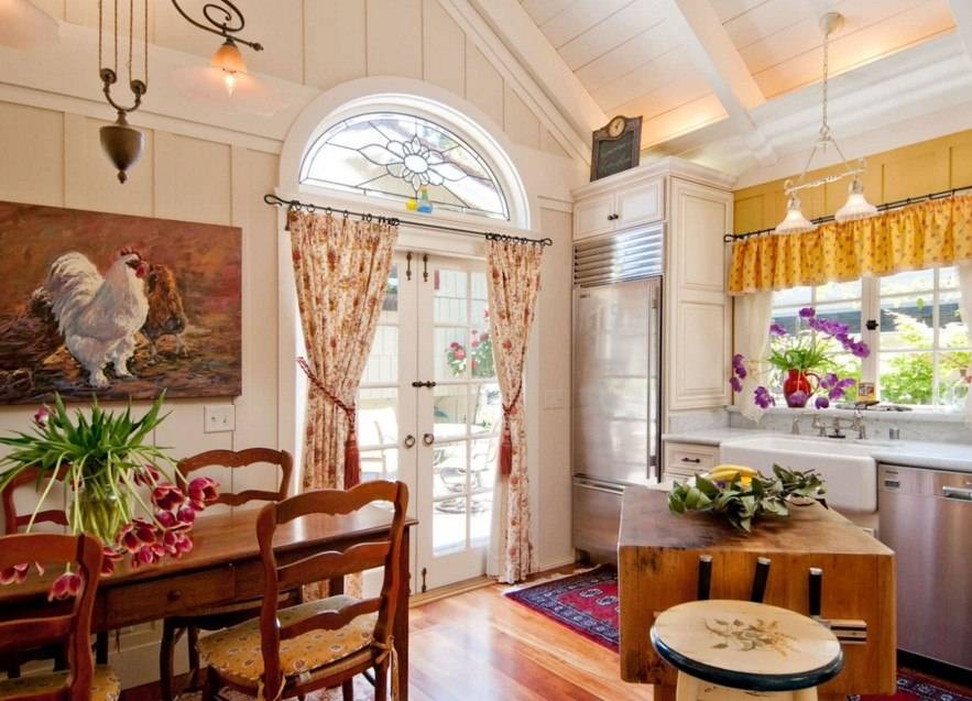 При оформлении кантри кухни шторам необходимо уделить особое внимание. Шторы являются тем элементом оформления, который способен грамотно подчеркнуть и выделить все преимущества дизайна кухни или же полностью свести их на нет
